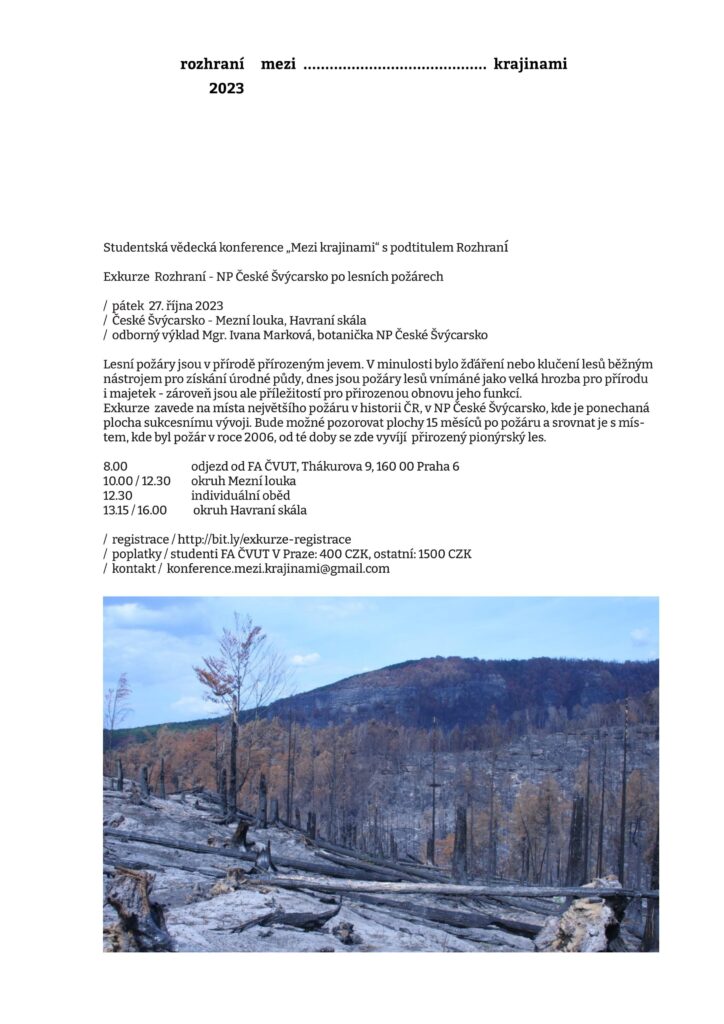 Konference Ústavu krajinářské architektury ČVUT v Praze, na téma Rozhraní. Jedná se o druhý ročník studentské vědecké konference, tento rok rozšířenou o exkurzi do Českého Švýcarska. Termín konference je čtvrtek 26. října 2023 na FA ČVUT, v pátek 27. října 2023 následuje exkurze. Podrobnosti níže ….