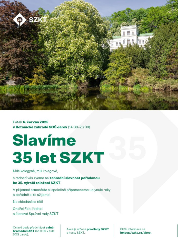 Rádi bychom vás při příležitosti tohoto výročí pozvali na společnou oslavu našich narozenin, která se uskuteční v pátek 6. června 2025 od 14.30 hod v krásném prostředí Botanické zahrady SOŠ Jarov. Oslavě bude předcházet slavnostní valná hromada SZKT, která se uskuteční od 9.30 hod v aule SOŠ Jarov.