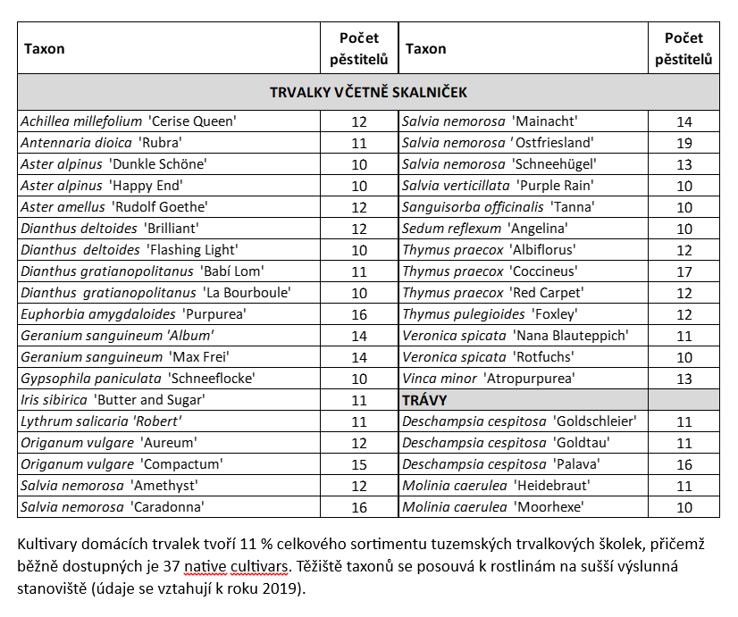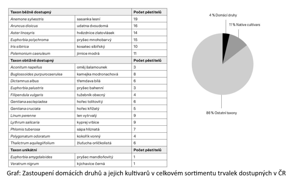 Průzkum trhu z roku 2019 analyzující sortiment 32 tuzemských pěstitelů peren ukázal, že trvalkové školky nabízejí více než 10 000 různých taxonů trvalek. Domácí rostliny jsou zastoupeny 386 druhy. Téměř čtyři stovky planých rostlin mohou být slušným základem pro tvorbu. Zkusme se ale pustit do hlubšího rozboru a rozdělit taxony podle četnosti výskytu ve školkách na běžně dostupné (daný taxon nabízí alespoň deset školek), obtížně dostupné (2–9 školek) a unikátní (jedna školka). Zjistíme, že běžně dostupných domácích trvalek je 36. Obtížně dostupných je 202 taxonů a více než třetina domácích trvalek je nabízena jedinou školkou. Analogická analýza zastoupení kultivarů domácích druhů (native cultivars) ukazuje, že školky nabízejí 1063 taxonů. S takovou škálou se jistě dá leccos hezkého podniknout. Pokud ale vyhodnotíme dostupnost, zjistíme, že běžně dostupných je 37 native cultivars. Pětistovka kultivarů je obtížně dostupná a druhá pětistovka je pěstovaná v jediné z poptávaných školek.