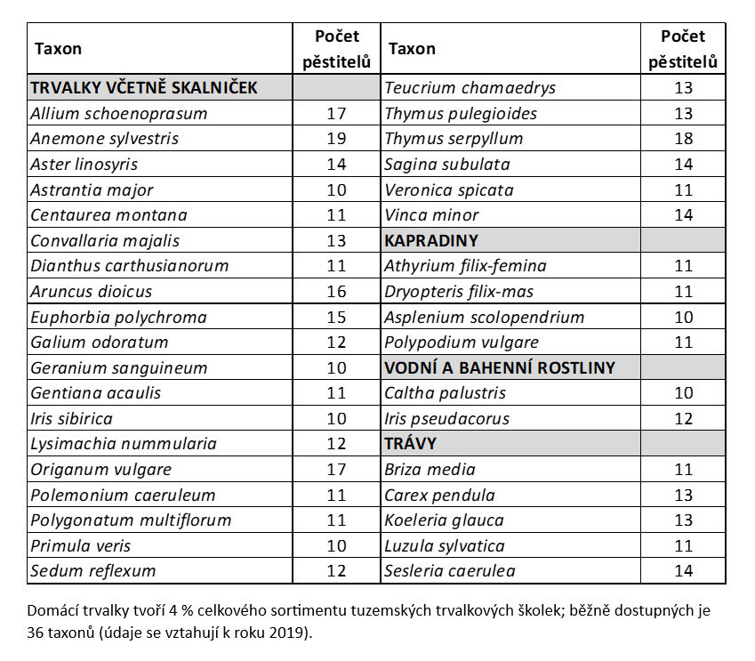 Tabulka č. 1 Výčet domácích druhů trvalek uvedených v Doporučeném sortimentu záhonových peren (včetně dostupnosti v roce 2019).
