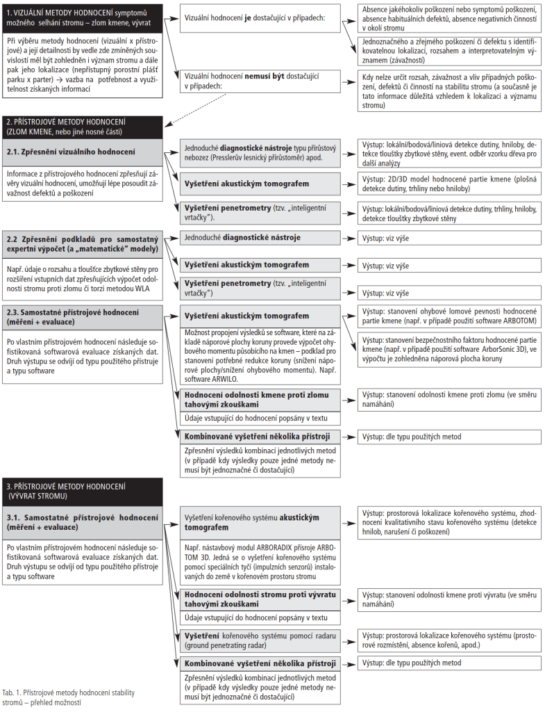 Tabulkový přehled by měl (v obecné rovině) přiblížit čtenáři, v jakých případech hodnotit stromy pouze vizuálně, a v jakých již přistoupit k použití přístrojových metod. Přehled ukazuje možnosti přístrojových metod a jejich využití v oblasti hodnocení stability stromů. Čtenáři by neměla uniknout jedna z velmi důležitých informací – konkrétní výstup získaný ze zvoleného typu přístrojové metody hodnocení. Z přehledu tak vyplývá, že každá z metod má specifickou vypovídací hodnotu a hodnotitel musí vědět, jakou informaci získá použitím té či oné metody. Hodnotitel musí znát také fyzikální princip zvolené metody, který ovlivňuje její použitelnost a výběr pro určité druhy defektů.