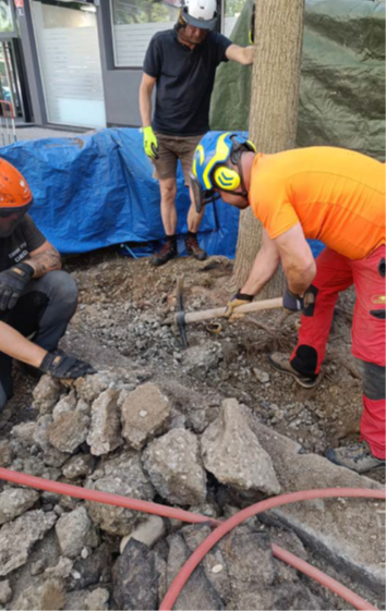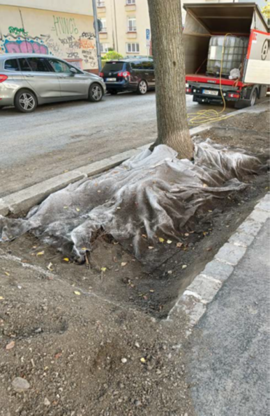 Důležité je mít na paměti, že kořeny vždy rostou tam, kde je jim to umožněno a kde najdou dostatek vody a půdního vzduchu. Prvotní informací je tedy pro nás prohlídka stanoviště, případně realizace kontrolních sond, další, neméně cennou je pak znalost technologie výsadby. Troufám si říct, že se blíží doba, kdy budeme pro dokumentace řešení prokořenitelných prostorů stromů ve městech chodit na stavební úřady (a snad jednou i do digitálních technických map obcí). U současných technologií budování prokořenitelných prostor již totiž naštěstí zdaleka neplatí, že kořenový prostor vymezují okraje rabátka viditelná na povrchu. Pokud stromy nemají dostatek lepšího prostoru, můžeme jejich kořeny zvláště u některých průbojnějších taxonů očekávat i v konstrukčních vrstvách chodníků a komunikací. Jako značně nespolehlivá se z našich zkušeností jeví opatření v podobě plastových protikořenových bariér a folií, zvláště jsou-li instalovány v těsné blízkosti kmene v malé délce a šíři. Strom dokáže vynaložit značné úsilí, aby je svými kořeny překonal. Zpozornět je třeba také, vedou-li v okolí stromu podzemní sítě nebo spatříme-li v okolí stromu pozůstatky stavební činnosti. V těchto případech je ideální vést nejprve kontrolní sondu v trase původních výkopů tak, abychom složitě nechránili mrtvé kořeny, které již dávno se stromem nejsou spojené. Pro hledání kořenů je možné využít i georadarů – některé zejména zahraniční firmy dnes nabízejí i sofistikovaná softwarová řešení zaměřená přímo na detekci prokořenění do hloubky až 3 m, a to bez nutnosti bourání zpevněných povrchů, které je překrývají. Jen je třeba dávat pozor na několik úskalí – měření georadarem probíhá v rastru, jehož hustota obvykle není tak veliká, aby zmapovala přesný průběh jednotlivých kořenů. Výsledkem je tedy pouze informace, zda se ve snímaném místě kořeny nacházejí, či nikoliv. Složité je také odlišení živých kořenů od mrtvých a případně i od jiných podzemních struktur. Stejně tak není vždy možné určit, zda se v daném místě nachází jeden mohutný kořen nebo hustá spleť jemných kořínků.