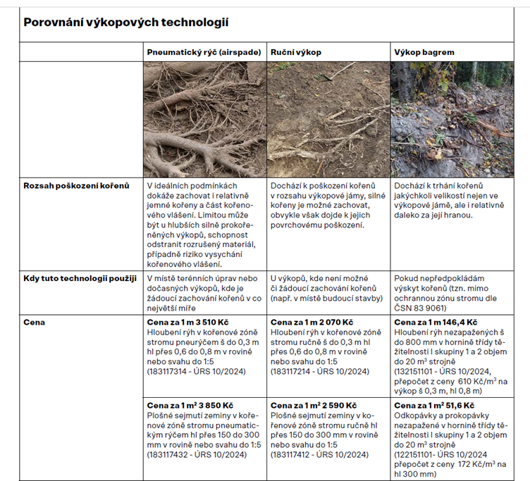 Často slýchané vyjádření „stromy na kapačkách“ nenaznačuje vyspělost našich schopností rovnající se humánní medicíně, ale má spíše pejorativní nádech odkazující na křehkost sofistikovaných technologických řešení. Zatím máme vůči medicíně co dohánět. Možná jednou budeme umět instalovat kořenové protézy, které stromům zajistí výživu a stabilitu i po porušení kořenů, zatím jsou však tyto úvahy v rovině sci-fi. A nám tedy nezbývá než kořeny stromů za každou cenu chránit. Oblastí, kde hrají „hodné“ stroje hlavní roli, je ochrana kořenů a vylepšování stanovištních podmínek. Zde je jednoznačným králem současnosti pneumatický rýč (air spade), který umí rozrušovat půdu pomocí stlačeného vzduchu, aniž by významně poškodil kořeny stromů. Provádění výkopů pomocí vzduchu poháněného kompresorem se objevilo v USA v 60. letech 20. století. Jedním z využití bylo například odhalování nevybuchlé munice a nášlapných min. V 80. letech 20. století objevili potenciál této technologie arboristé a zahradníci. Pneumatický rýč můžeme použít, potřebujeme-li v nějakém místě zjistit rozsah prokořenění nebo odhalit kořenový systém, provádět v něm výkopy či terénní úpravy, ale i v případech, že potřebujeme narušovat zhutnění povrchových vrstev půdy nebo vylepšit stanoviště stromu. Pneumatický rýč může být také cenným nástrojem pro napravování utopených výsadeb – odhalování kořenového krčku a své uplatnění najde i v oblasti přesazování stromů.