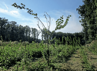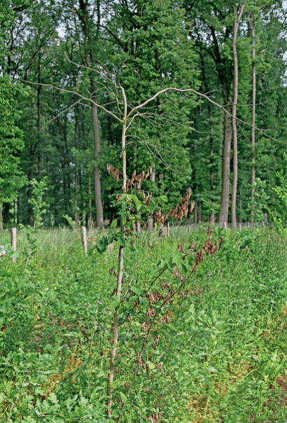 Pro sledování odolnosti jilmů ke grafióze bylo vybráno osm různých taxonů jilmů ve věku tři až čtyři roky. Minimální věk tři roky a růst na pokusné ploše alespoň jeden rok zabezpečují reprezentativnost pokusu pro dospělé jedince. Náchylnost ke grafióze se sice do určitě míry během let u daného stromu mění, ale bylo zjištěno, že po třetím roku růstu již ne zásadně (SOLLA et al., 2005b). Dne 31. 3. 2009 bylo na pasece LZ Židlochovice vysazeno od každého taxonu deset jedinců. Prostokořenný sadební materiál poskytla firma Arboeko s. r. o. Pro inokulaci, která proběhla 8. 6. 2010, bylo vybráno vždy šest zdravých a dobře rostoucích jedinců od každého taxonu. Jeden se ponechal jako negativní kontrola a zbylých pět bylo naočkováno kmenem M3 (O. novo-ulmi, izolován M. Dvořákem v květnu 2008 v Brně-Komárově). Na ostří nože se nanesly dvě kapky suspenze a provedl se zářez na severní straně v polovině koruny. Podle metodiky, kterou publikoval Solla et al. (2005a), proběhla kontrola testovaných stromů po čtyřech, deseti, šestnácti týdnech a nakonec po jednom roce od inokulace. Při kontrolách se infikace O. novo-ulmi hodnotila stupněm odlistění koruny. Defoliace byla hodnocena dvěma nezávislými odhadci a zaznamenávána v desítkách procent. Pro jen nepatrné poškození koruny bylo zavedeno hodnocení do pěti procent. (obr. 2)