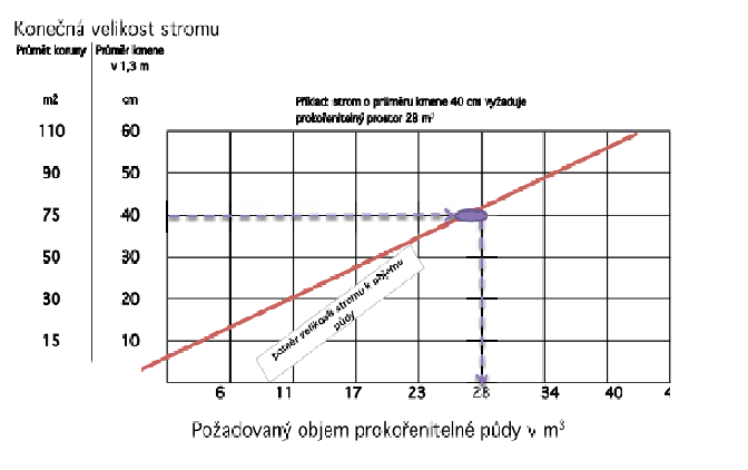 Kalkulaci potřebného prokořenitelného objemu půdy provádíme na základě následujícího grafu. Kalkulovaný prokořenitelný objem půdy zahrnuje půdu v prostoru výsadbové jámy, stávající nebo připravenou prokořenitelnou půdu pod chodníkem a nezhutněnou půdu, do které mohou kořeny prorůst v blízkém okolí (parkové a zahradní plochy).